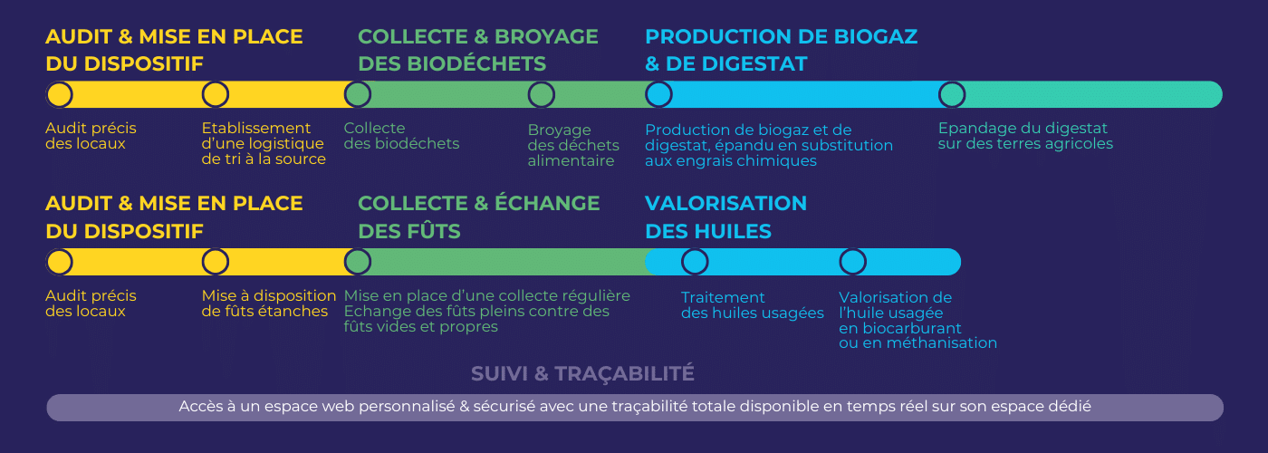 Ecovalim prend en charge vos biodéchets et huiles usagées à chaque étape : diagnostic, collecte, traitement et valorisation.